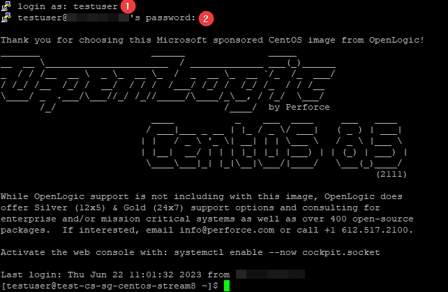 In the opened console,enter the username (1) and a password (2)specified during virtual machine creation. Note that the password will not be visible while typing.
