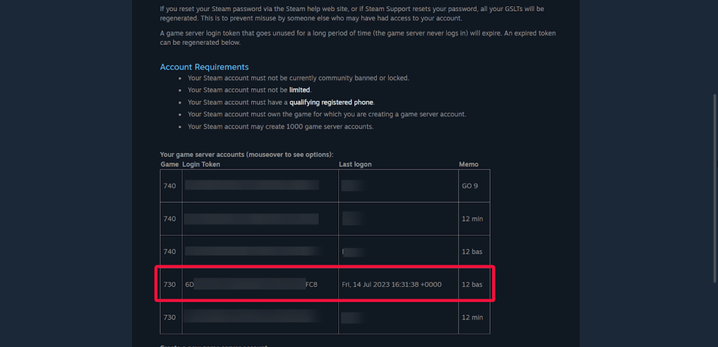 - To display the server in the in-game server browser, you should add a GSLT token to the configuration file. To create a token, go to the following page in your Steam account: Steam Game Server Account Management.