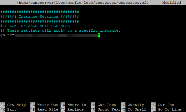 Press Insert on the keyboard to enter edit mode. Add the parameter gslt=”Token” at the end of the file, replacing TOKEN with the generated token from Section 2. Use the arrow keys on the keyboard to move to the desired line. To paste the copied text, use the right mouse button.