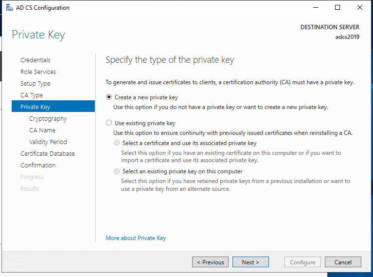 - On the Private Key page, choose between “Create a new private key” or “Use existing private key.” Click Next.