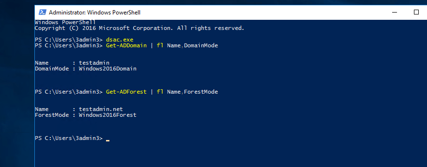 - Also you can use Get-ADDomain | fl Name,DomainMode and Get-ADForest | fl Name,ForestMode from powershell to confirm the domain and forest functional levels