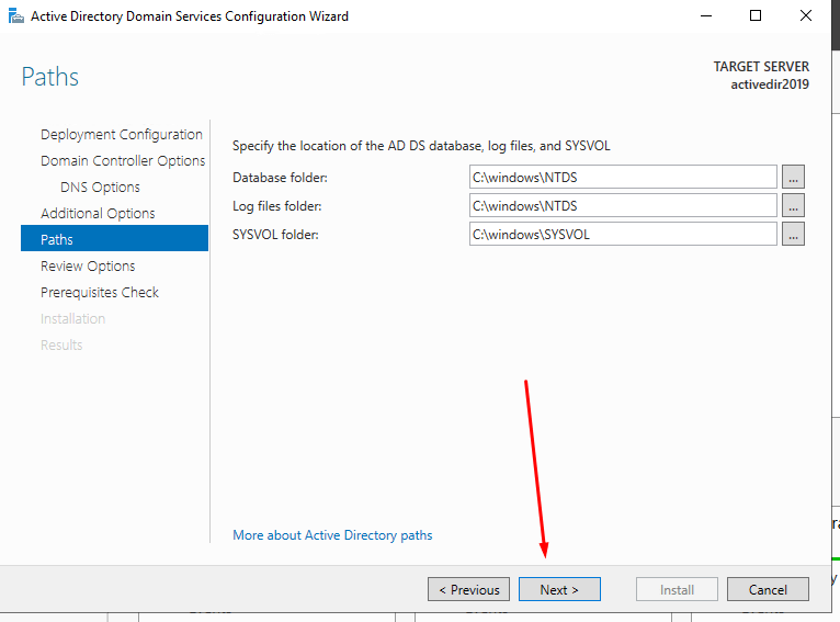 - The next page is to define the NTDS, SYSVOL, and LOG file folders. You can keep either the default or define different paths for these. This demo shows how to keep the default paths. Once changes are made, click <next> to continue.