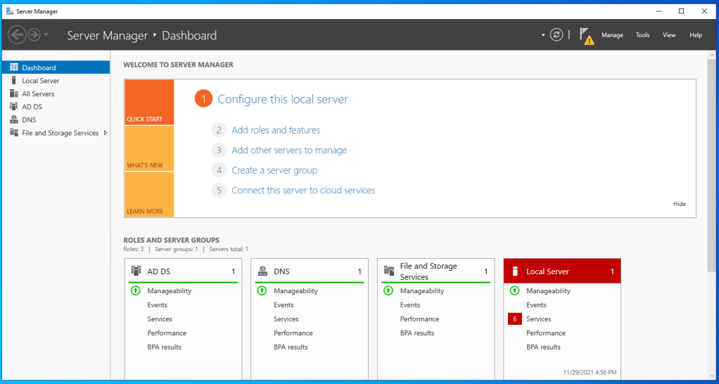 - Open up Server Manager, click on the yellow notification, and select Promote this server to a domain controller