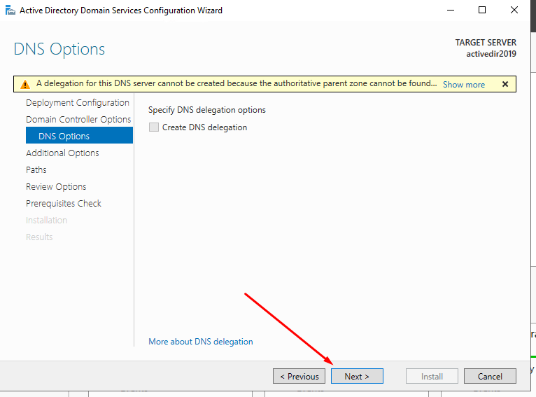 - Since we are creating the first DNS server in the new forest, it is not necessary to select additional parameters. Click <next> to proceed.