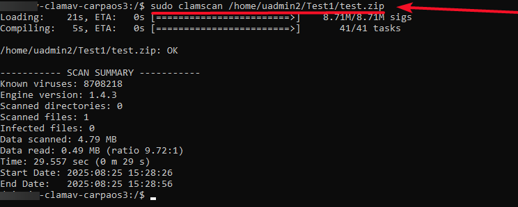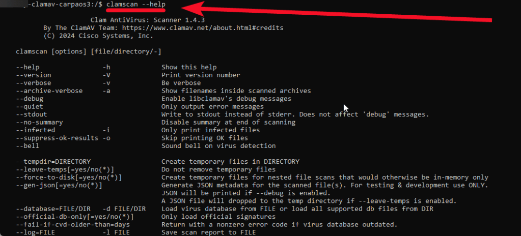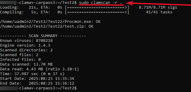 Scan the current folder with subfolders- >sudo clamscan -r .