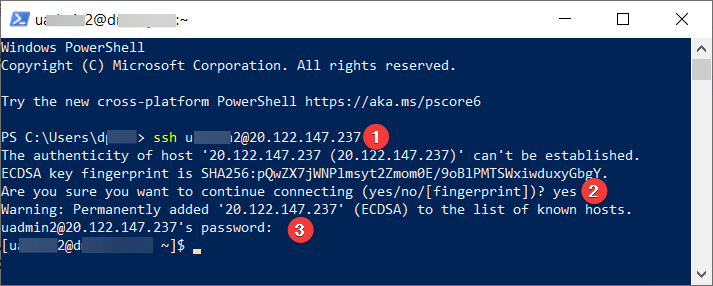 In the Windows 10 operating system (starting with version 1809 ), an OpenSSH client is available, with which you can connect to Linux servers via SSH. If Windows 10 is suitable and the OpenSSH client is installed, you can start connecting via SSH. To do this, launch a normal Windows command prompt and enter the command “ssh user@*vm_ip*” (1), where “user” is the username that was specified while creating the virtual machine and “*vm_ip*” is the VM IP address.