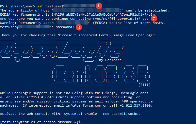 Then type “Yes” (2) to confirm the connection and then enter the password (3) specified during virtual machine creation.