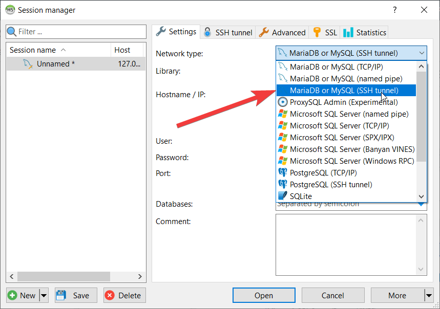 - In the “Network Type” field, select the “MariaDB or MySQL (SSH Tunnel)”