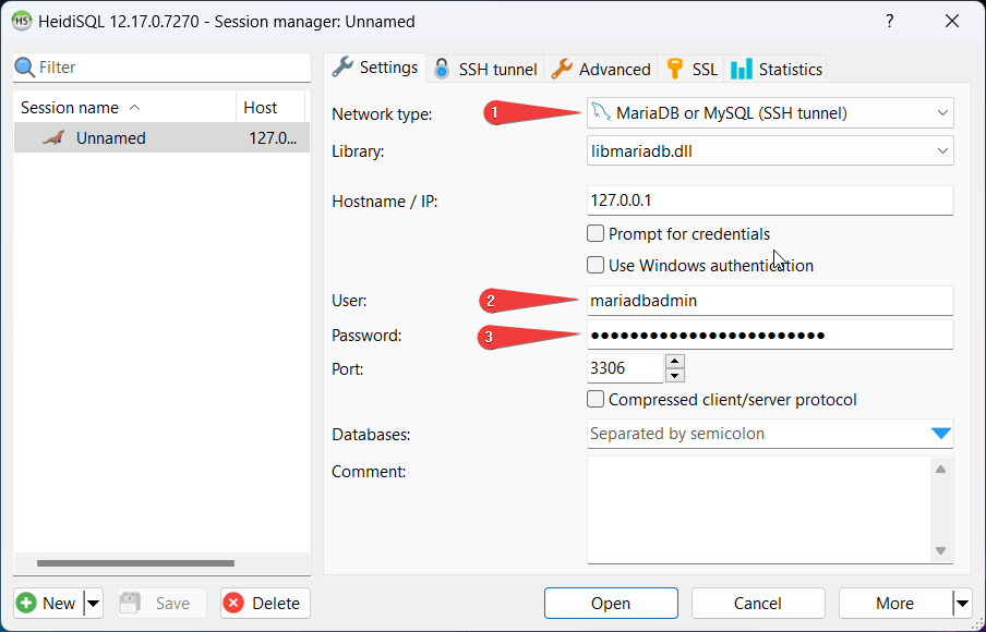 - In the Network Type field, select MariaDB or MySQL (SSH Tunnel) (1), enter Username (2) and Password (3) from step 4. Leave all other fields as default.