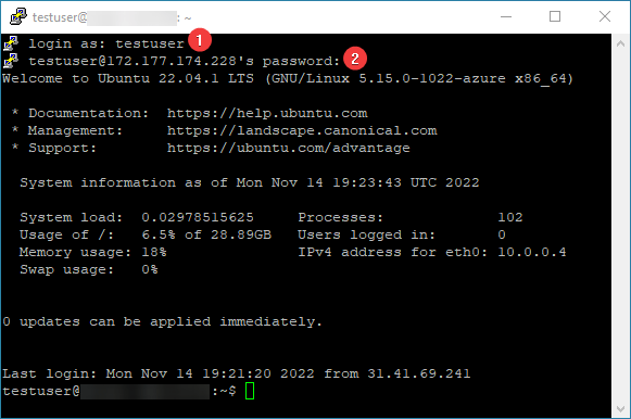 In the opened console, you will need to enter a username (1) and a password (2) that were specified while the VM was being created (you’ll not see the password in the console while entering it).