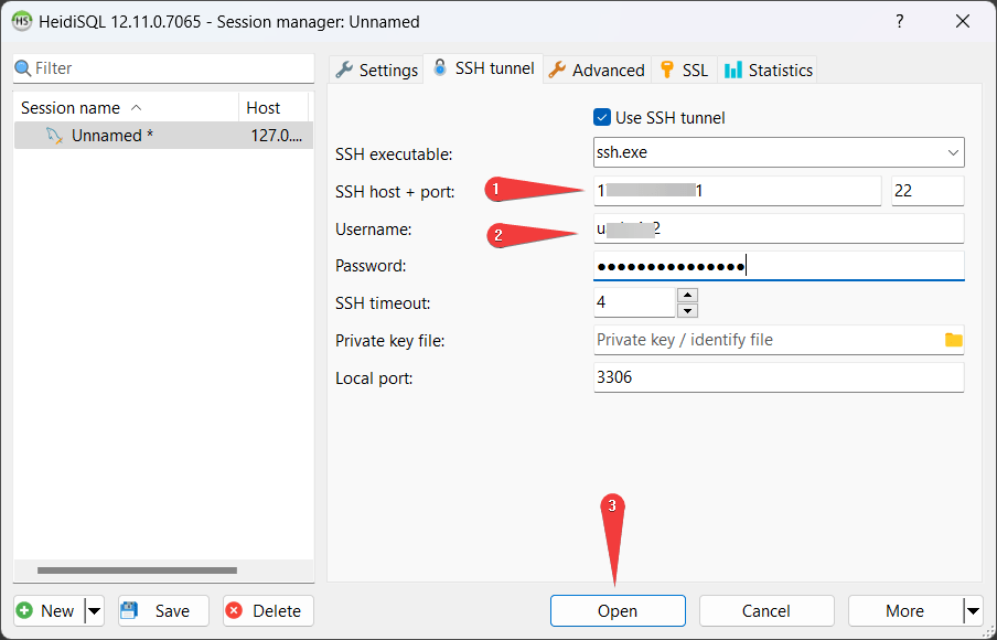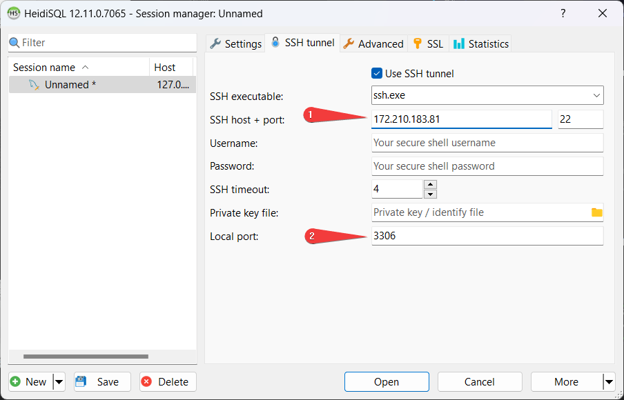 - In the SSH host + port field (1), enter the address of the virtual machine and set Local port 3306 (2)