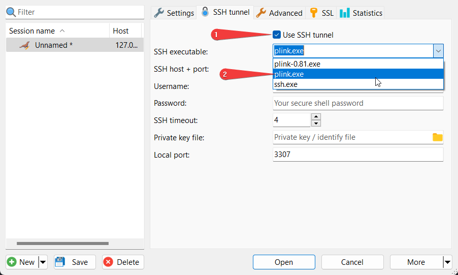 - Go to the SSH tunnel tab, check Use SSH tunnel (1) and select plink.exe (2)