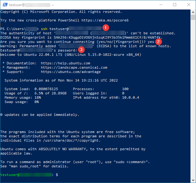 In the Windows 10 operating system (starting with version 1809 ), an OpenSSH client is available, with which you can connect to Linux servers via SSH. If Windows 10 is suitable and the OpenSSH client is installed, you can start connecting via SSH. To do this, launch a normal Windows command prompt and enter the command “ssh user@*vm_ip*” (1), where “user” is the username that was specified while creating the virtual machine and “*vm_ip*” is the VM IP address.