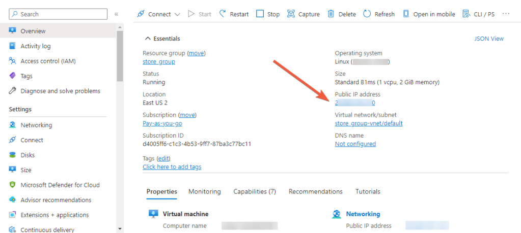 - For the connection to the server, you should know the IP address of the VM. You can find it in the personal account of Azure. Select the virtual machine from the list. By clicking the item “Overview”, your IP is displayed in the “Public IP Address” line.