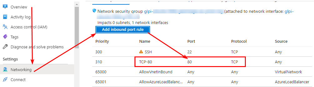 - Next, you should open port 80 TCP in the network properties in the Azure firewall.