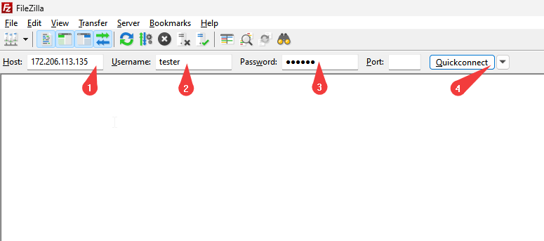 - After installing and running the FileZilla client, you need to follow these steps to connect to the VSFTP server: