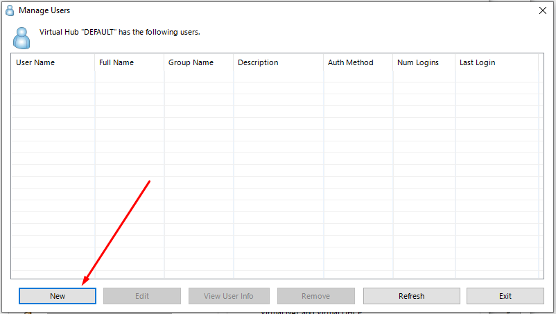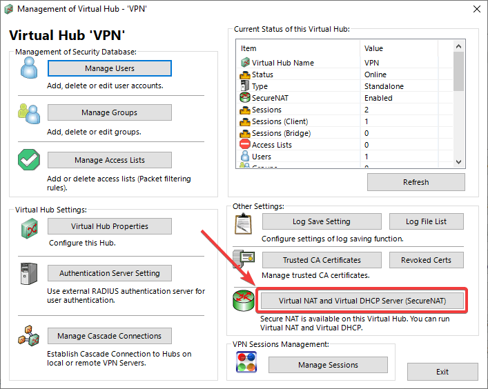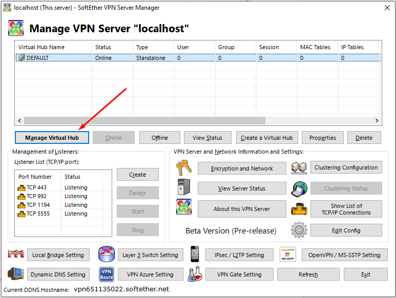 - To use the VPN, you need to add a user or use the default one. Click the Manage Virtual Hub button.