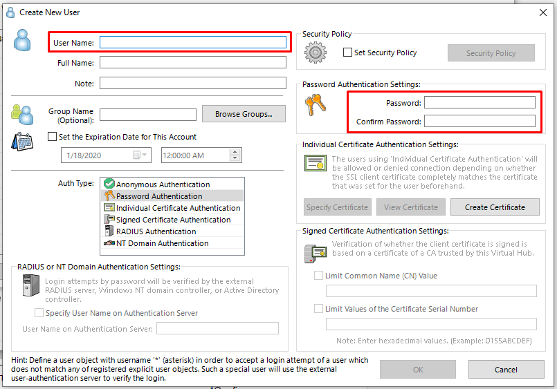 - You must insert the user’s name into the User Name field, type the password into the Password field, and verify it by re-entering the password into the Confirm Password field. After you have entered the data, click OK.