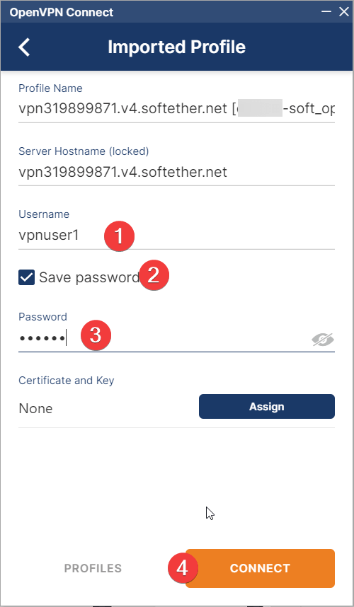 - Then enter Username (1), Select checkbox Save password (2) for your comfort, enter Password (3), and click Connect (4)
