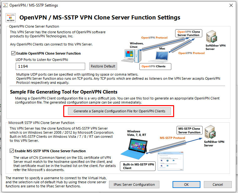 - To create configuration files, click the OpenVPN / MS-SSTP Settings button.