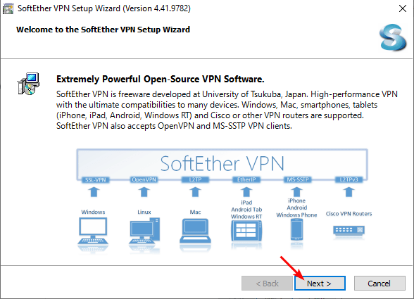 - Download the SoftEther VPN Server installer and run it after completing the download. In the window that opens, click “Next”: