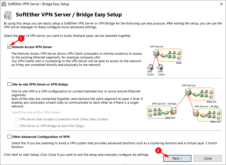 - Next, in the “SoftEther VPN Server / Bridge Easy Setup” window, select the setting Remote Access VPN Server and click Next: