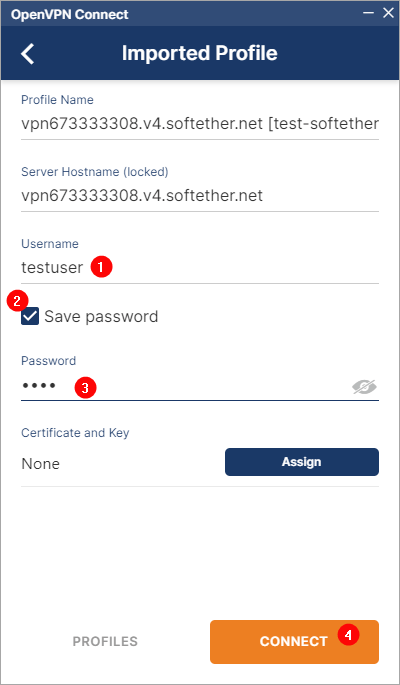 - Then enter “Username” (1), select the checkbox “Save password” (2) for your comfort, enter “Password” (3), and click “Connect” (4).