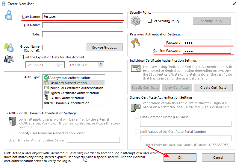 - It’s necessary to insert the name of the user into the “User Name” field, type the password into the “Password” field, and verify it by re-entering the password into the “Confirm Password” field. After the data were entered, click “OK”.