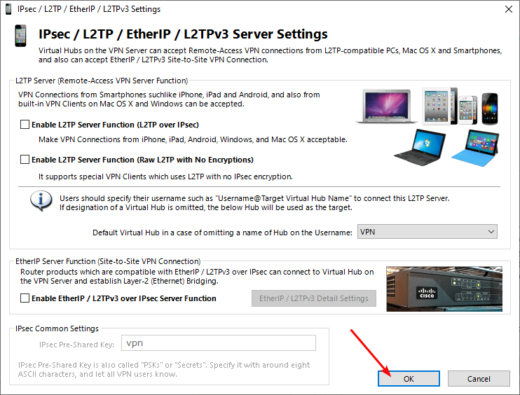 - Click OK in the “IP / L2TP / EtherIP / L2TPv3 Settings” window:
