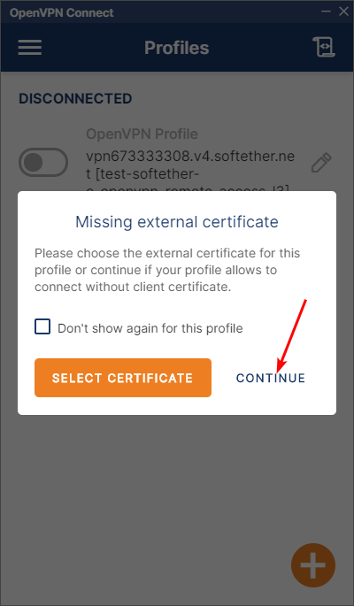 - Click “Continue” to confirm use without a certificate.