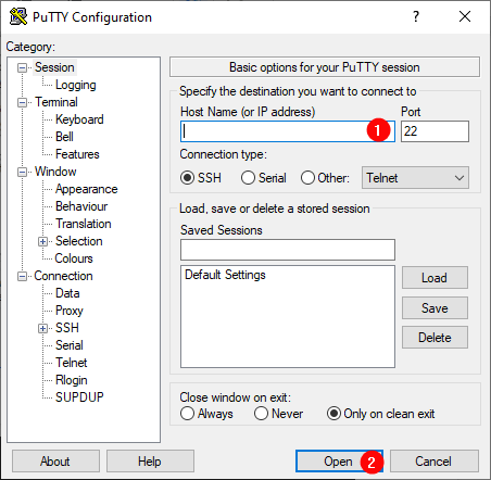 Run PuTTY, enter the VM address in the “Host” field, and click “Open” to connect.