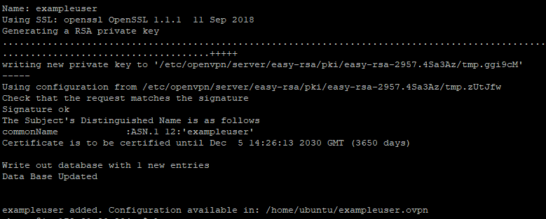 - The last line will tell you where the config file is available (exampleuser.ovpn in this case)