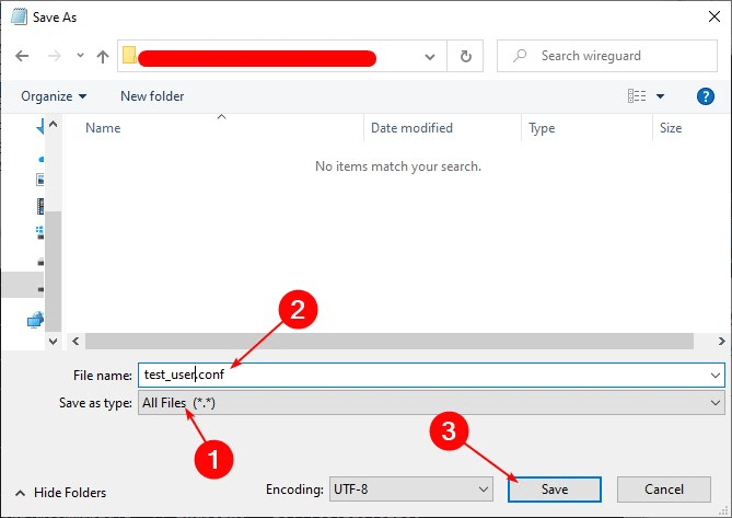 - In the line Save as type, select All files from the drop-down list. In the File name line, enter the file name and the “.conf” extension. Save the document by clicking on the Save button.