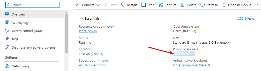 After purchasing and starting the VM, you should know its IP address. You can find it in the personal account of Azure. You need to select the virtual machine from the list. By clicking the item “Overview”, your IP is displayed in the line “Public IP Address”.