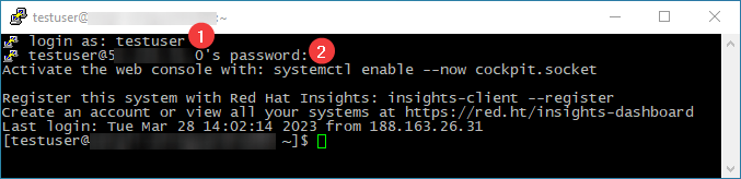 In the opened console, you will need to enter a username (1) and a password (2) that were specified while the VM was being created (you’ll not see the password in the console while entering it).