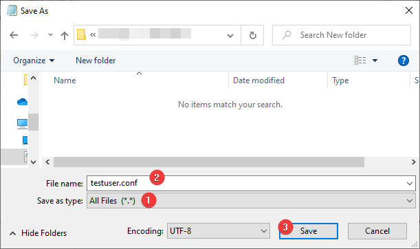 - In the line Save as type, select All files from the drop-down list. In the File name line, enter the file name and the “.conf” extension. Save the document by clicking on the Save button.