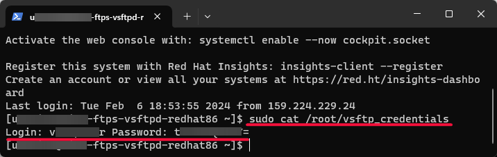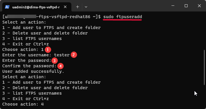 Select “1 – Add user to FTPS and create folder” (1) and press ‘Enter’.