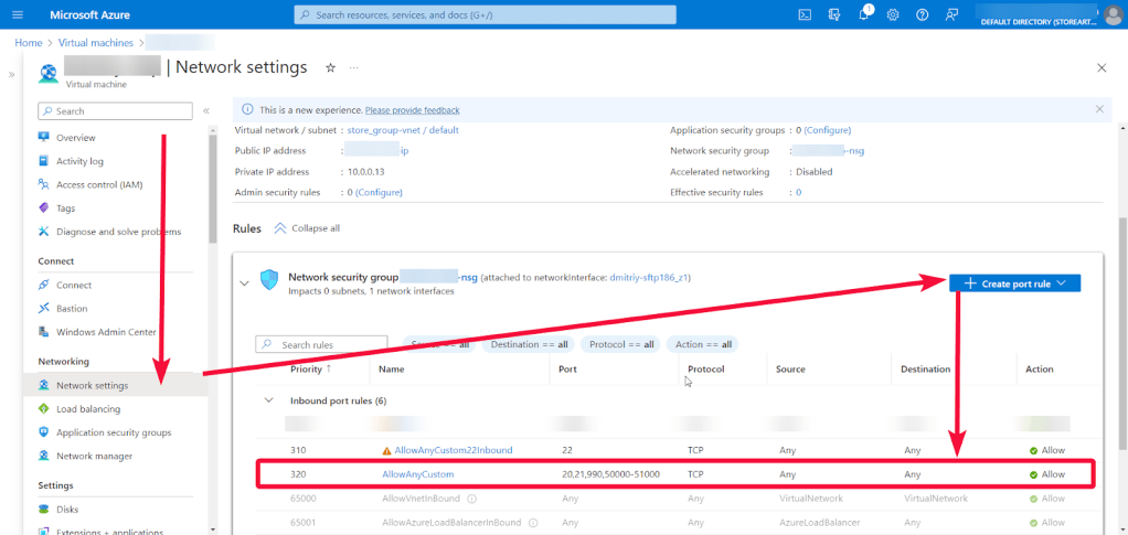 - To work, you must open ports 20, 21, 22, 990, 50000-51000 (TCP) in the network properties in the Azure firewall.